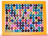 Des boules percées forment, par rangs successifs, une surface colorée mouvante. Mais pour que le boulier ne demeure pas l'instrument élémentaire que nous connaissons et permette des assemblages infinis (n°1), il faut que ce système respecte certaines conditions : - que l'on prenne soin de rendre les boules au moins bicolores ; - qu'une moitié des boules soit de couleur sombre et l'autre de couleur claire ; - qu'une des couleurs primaires soit presque entièrement supprimée pour faciliter l'harmonisation du tout ; - que le nombre d'éléments mis en jeu soit important, mais non pas tel qu'on ne distingue plus nettement chaque élément ; - qu'on ait distribué suffisamment de couleurs vives pour que s'annulent les éventuelles tensions excessives ; - que le spectateur puisse suivre ou effacer à sa guise certains chemins colorés, en créer d'autres qu'il va privilégier.